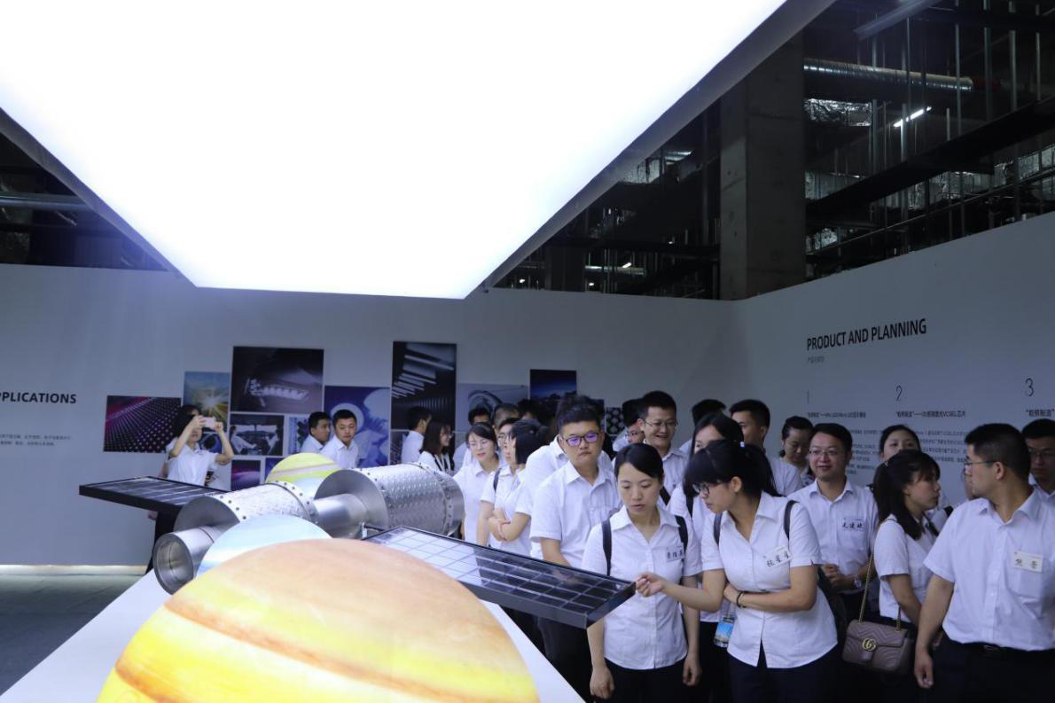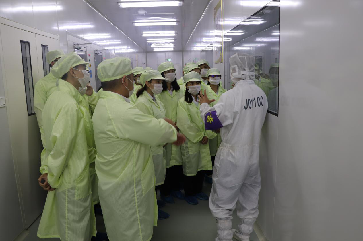 在展廳,學(xué)研班學(xué)員們了解了公司的企業(yè)文化、主要產(chǎn)品以及江西乾照光電的未來規(guī)劃。在生產(chǎn)車間,學(xué)員們觀摩了外延片的生長、檢測工藝流程,了解了芯片生產(chǎn)的全過程以及相關(guān)設(shè)備的功能介紹,特別是在芯片目檢站,學(xué)員們通過顯微鏡近距離觀察放大的芯片時,紛紛發(fā)出了驚嘆聲。
