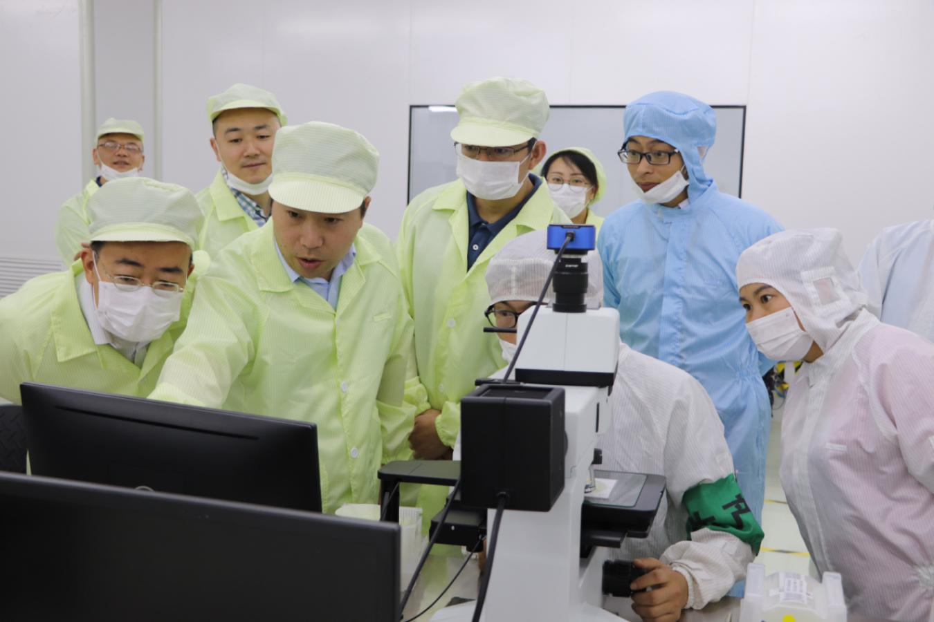 隨后,考察組一行前往生產車間進行參觀,朱局長仔細觀摩了藍綠芯片的生產制作流程和芯片的質檢工作程序,對公司的發展現狀表示了充分的肯定。