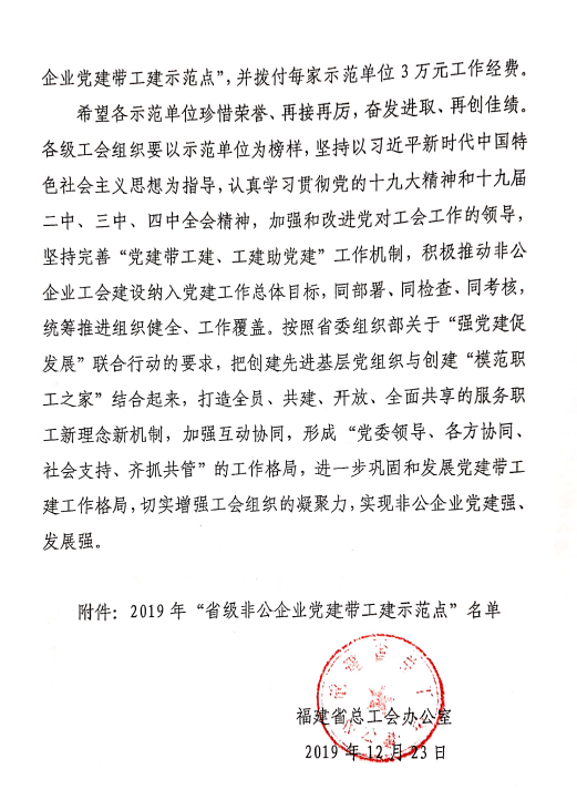 近日,為深入學(xué)習(xí)貫徹習(xí)近平新時(shí)代中國(guó)特色社會(huì)主義思想,認(rèn)真學(xué)習(xí)貫徹習(xí)近平總書記關(guān)于工人階級(jí)和工會(huì)工作的重要論述,深化黨建帶工建工作機(jī)制,福建省總工會(huì)研究決定,命名省內(nèi)20家單位為2019年“省級(jí)非公企業(yè)黨建帶工建示范點(diǎn)”,廈門乾照光電股份有限公司榮獲此稱號(hào)。