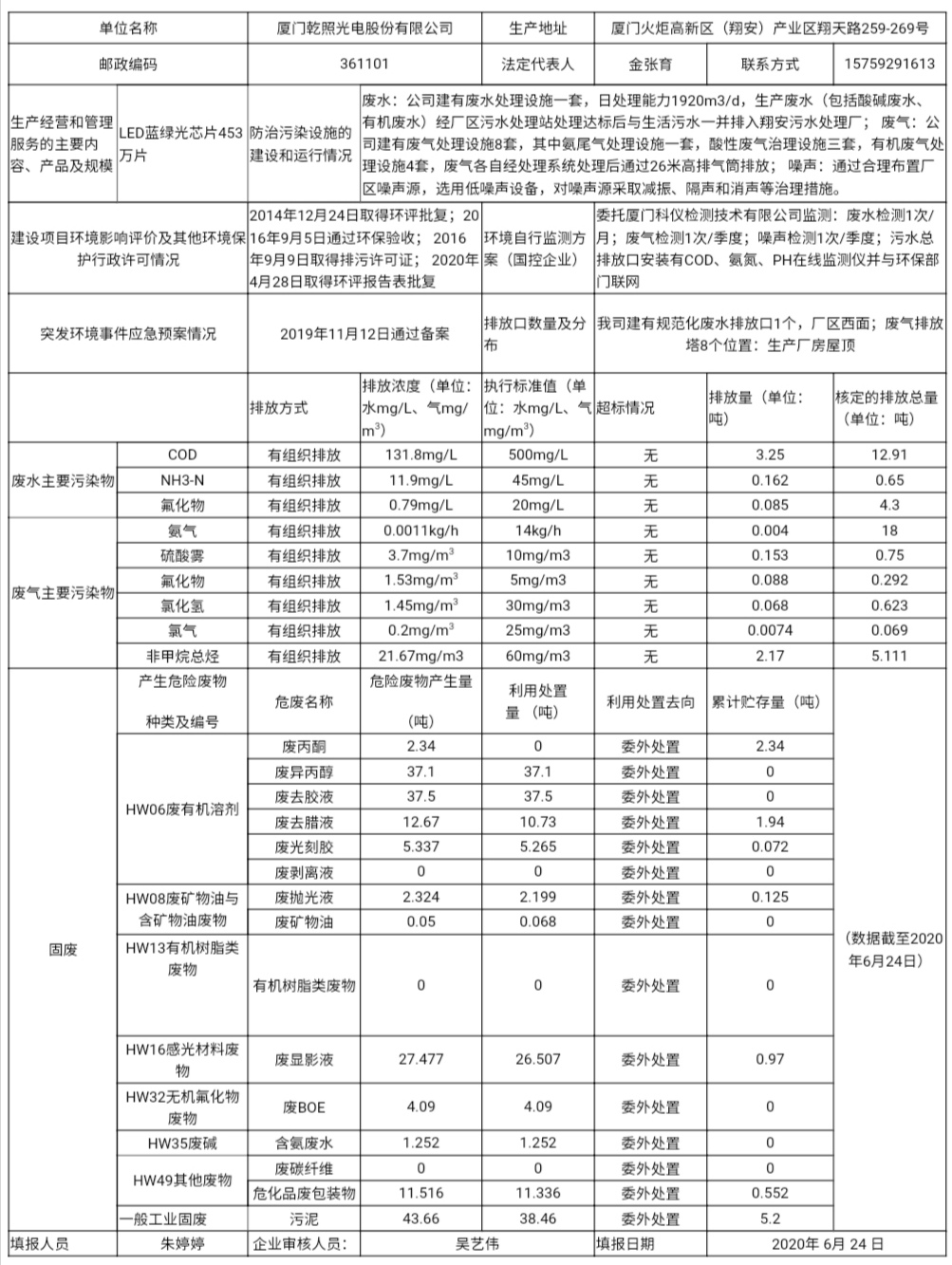 廈門乾照光電股份有限公司環境信息表
