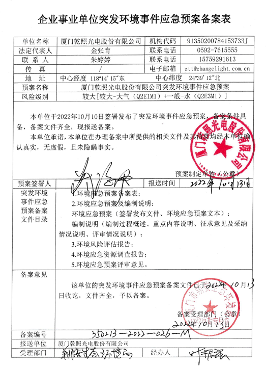 廈門乾照光電股份有限公司突發(fā)環(huán)境事件應急預案公示
