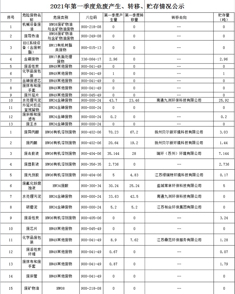 揚州乾照光電有限公司2021年第一季度危廢產生、轉移、貯存情況公示